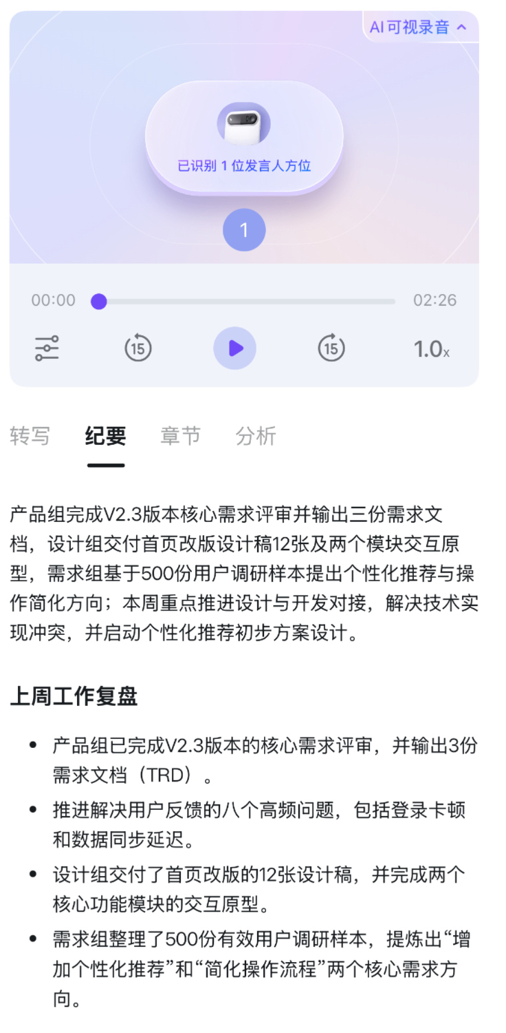 在开会时,我会选择会议纪要模版,会议结束,上传录音,其强大的AI能力还可以自动感知发言人的方位,对于会议内容取其精华,弃其糟粕,精准提取核心观点、待办事项和数据细节,并生成简洁的会议纪要,节省了我百分之九十的整理时间,提高了工作效率,非常智能。有了它,都不用加班了!
