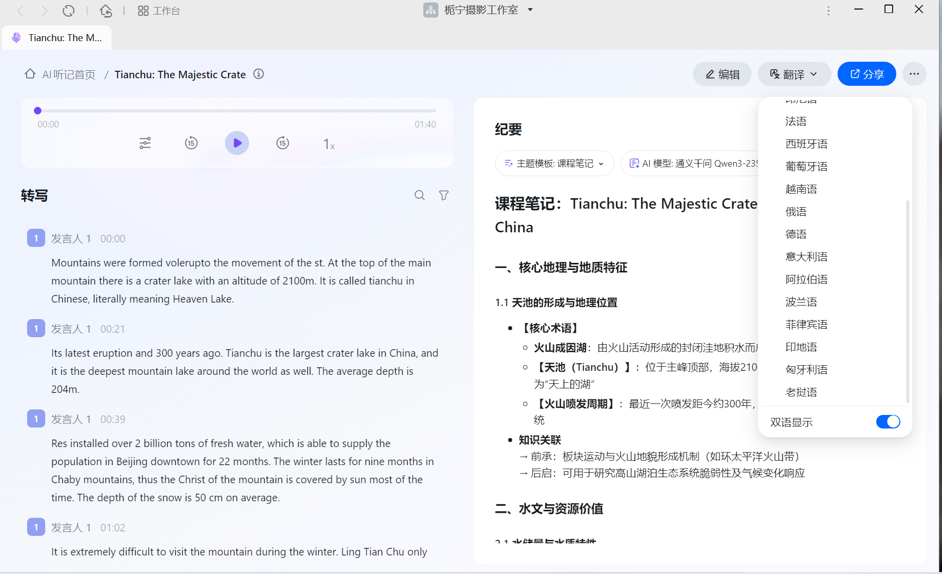 值得一提的是,PC端在处理A1的录音文件时,支持的翻译语言数量(19国)甚至比手机端(7国)更多。
