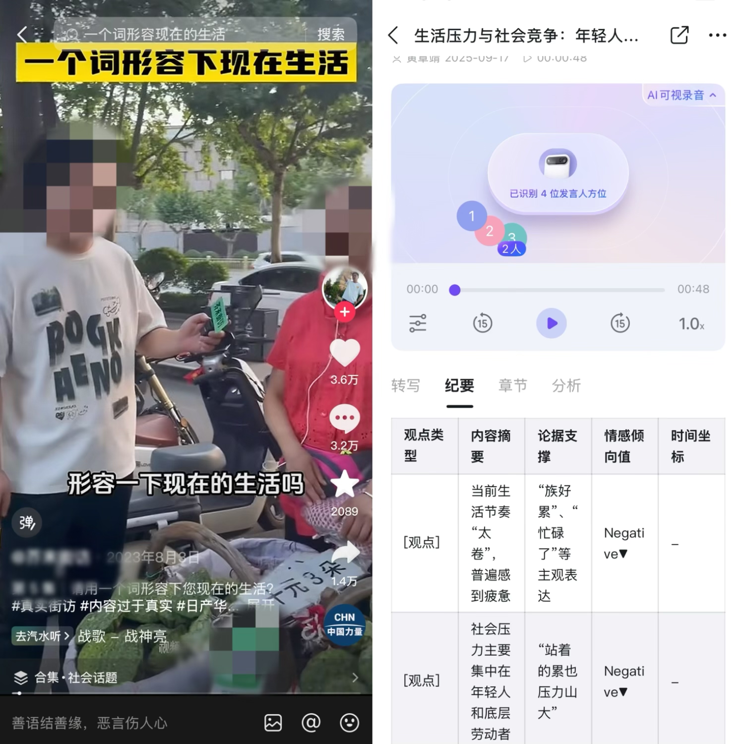 我在某音上截取某段环境嘈杂的街头采访的素材,用钉钉AI录音,其远距离拾音和降噪功能,使得音频还是很清晰,并且钉钉AI能让采访者在采访结束,回程途中即在钉钉APP里完成初稿整理,抢出发稿时间,保证了稿件的时效性,也减轻了记者后期工作负担。