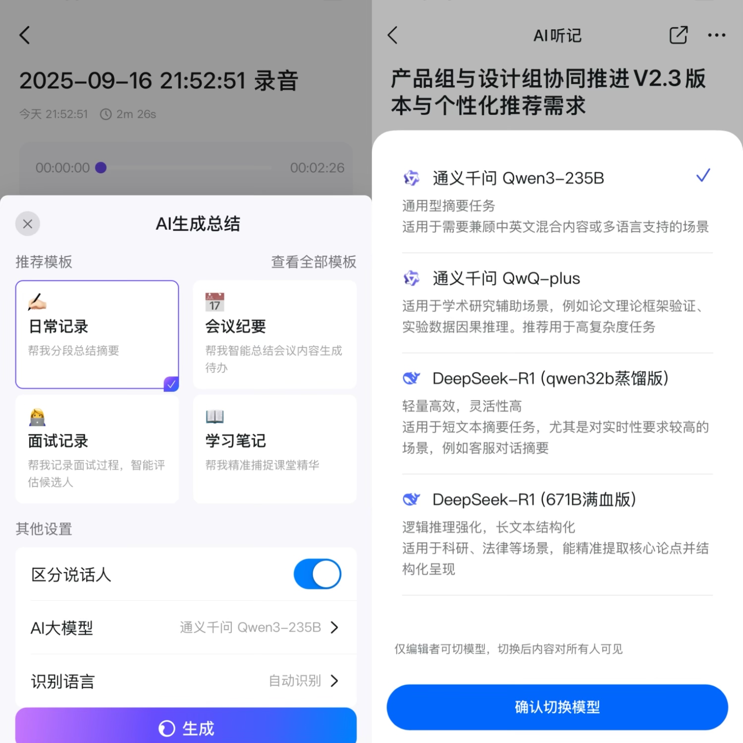 点生成后会弹出模板和AI模型的选项,它内置了很多可选择的模板,大类别上分有会议、电话、教育、采访、咨询等,还内置了包括阿里自研的通义千问(Qwen-plus、QwQ-plus)、DeepSeek-R1/V3等AI模型,根据不同场景智能分析内容,甚至提供建议,精准服务到各行各业的打工人,很人性化。
