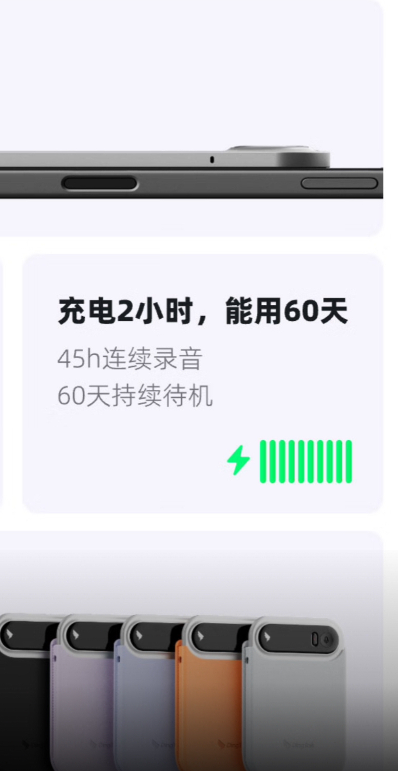 官方数据显示,钉钉A1内置660mAh大容量电池,搭配6nm超低功耗AI音频处理芯片,支持60天超长待机,连续录音可达45小时,完全满足日常办公需求。