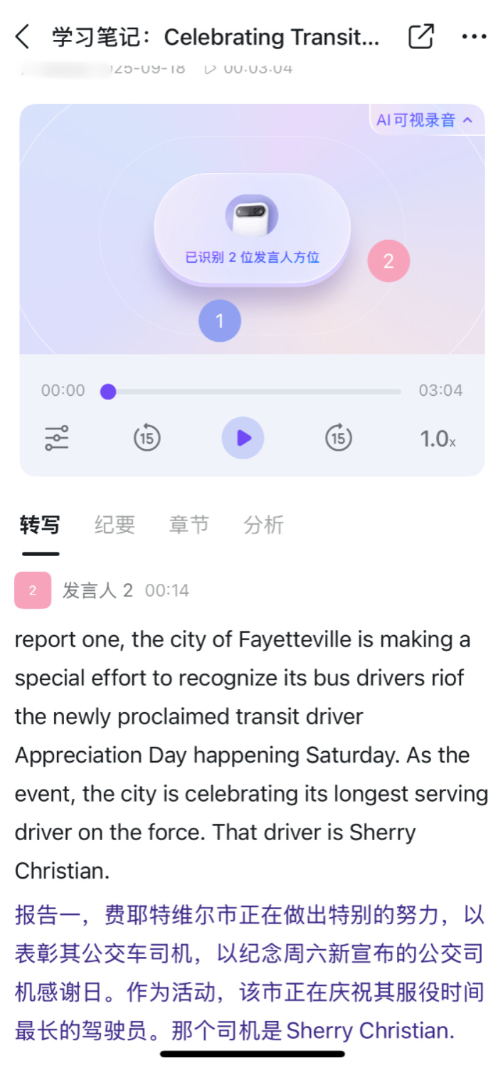 ▼采访工作者的福音在看户外采访节目的时候,常常能听到周边环境嘈杂,有时候都听不清被采访者在说什么,也会影响到媒体记者的工作,录音质量难保证,还得花费大量时间手动转写,效率低下不说,还容易出错,搞得赶稿时整理的压力会很大。