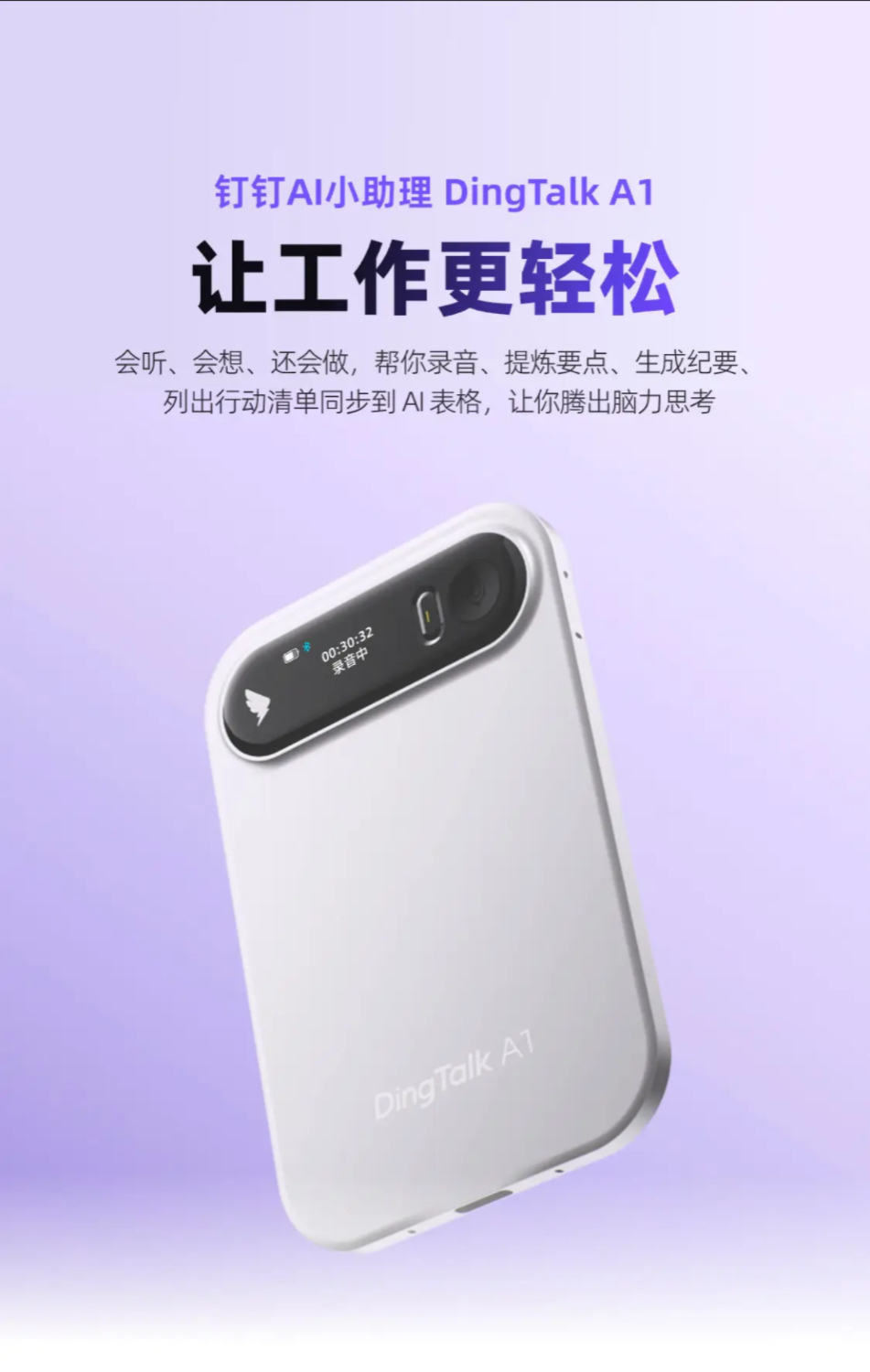 钉钉A1的核心功能是录音及其AI智能处理。它不仅能清晰记录声音,还能借助钉钉的AI大模型能力,对录音内容进行转写、翻译、总结和分析。