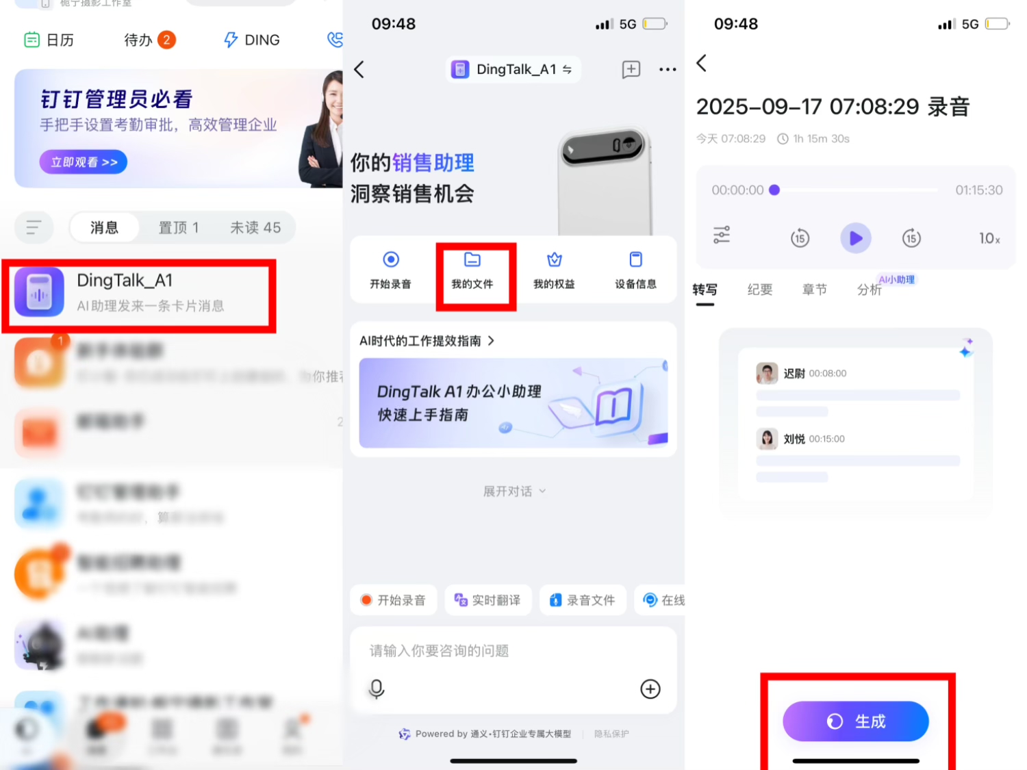 作为常常在会议中打盹儿的员工,我总是在开会时选择坐在角落里,难免会遗漏要点,记录不全,会后整理会议纪要更是痛苦万分,但有了钉钉AI小助理,这一切都变得轻松无比。开会时开启录音,会议结束录音完成后,会自动储存到我的文件里,在钉钉APP首页的消息列表界面,会看到Ding Talk_A1的标识,在我的文件里找到录音文件,再点击生成