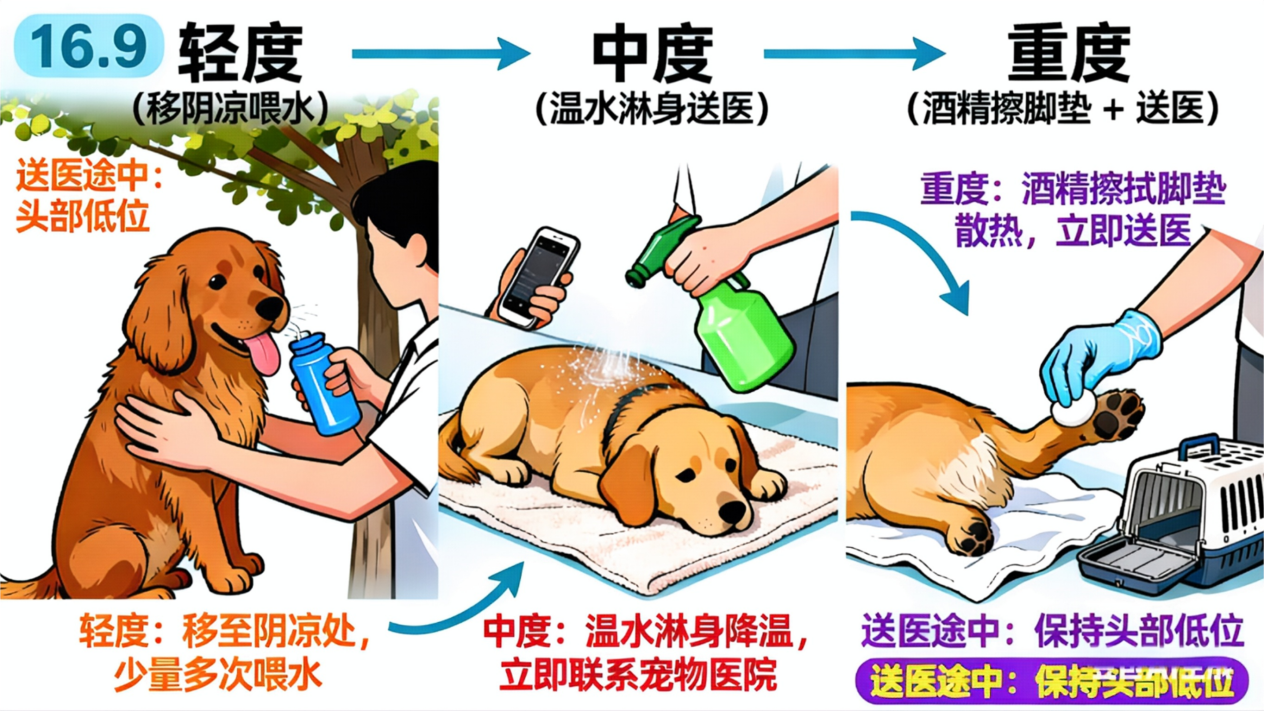 中暑急救:轻度中暑(流口水、急喘)可移至阴凉处吹风扇,喂少量温水;中度中暑(呼吸困难、呆滞)需用常温水淋湿全身后立即送医;重度昏迷时,用酒精擦拭脚垫降温,送医途中保持头部低位畅通呼吸。