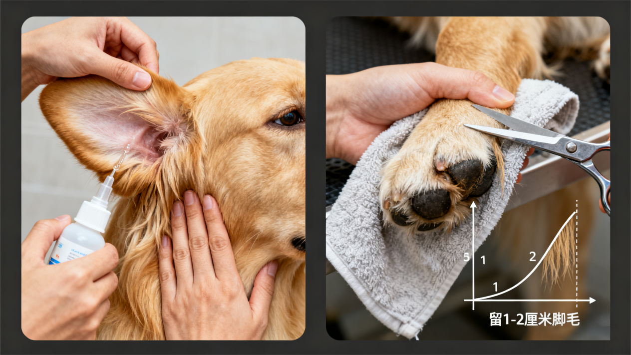 耳部护理:垂耳犬(金毛、拉布拉多)每周用宠物专用洗耳液清洁 1 次,发现耳朵发红、有酸臭味立即处理,耳毛过长需定期修剪。