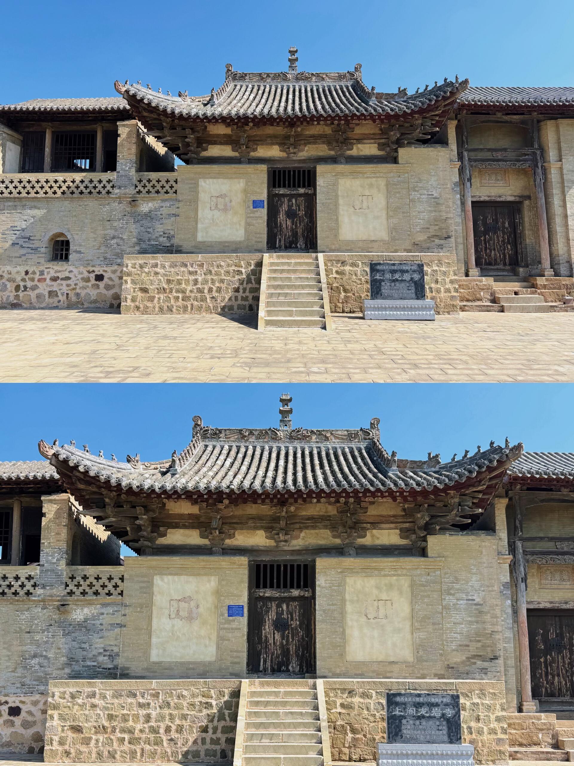 顺着沁水西部的盘山公路往深处走,柏油路在山间盘旋成细线,直到被一片依山而建的灰瓦屋顶截断——这里便是上阁村,古名姚家寨,舜帝后裔姚氏族人世代栖居的地方。村西高岗上立着的那座寺院格外打眼,红墙在苍翠山影里若隐若现,檐角挑着流云,像位沉默的老者俯瞰着松峪河与东沟河绕村而过,春种时看田垄染绿,秋收时望谷场堆金,这便是藏着宋元密码的龙岩寺。很难想象,这样一座攥着千年木构精髓的寺院,至今还只是省级文物保护单位,在山西遍地的国保古建中,像颗蒙尘的珍珠,等着懂行的人弯腰拾起。