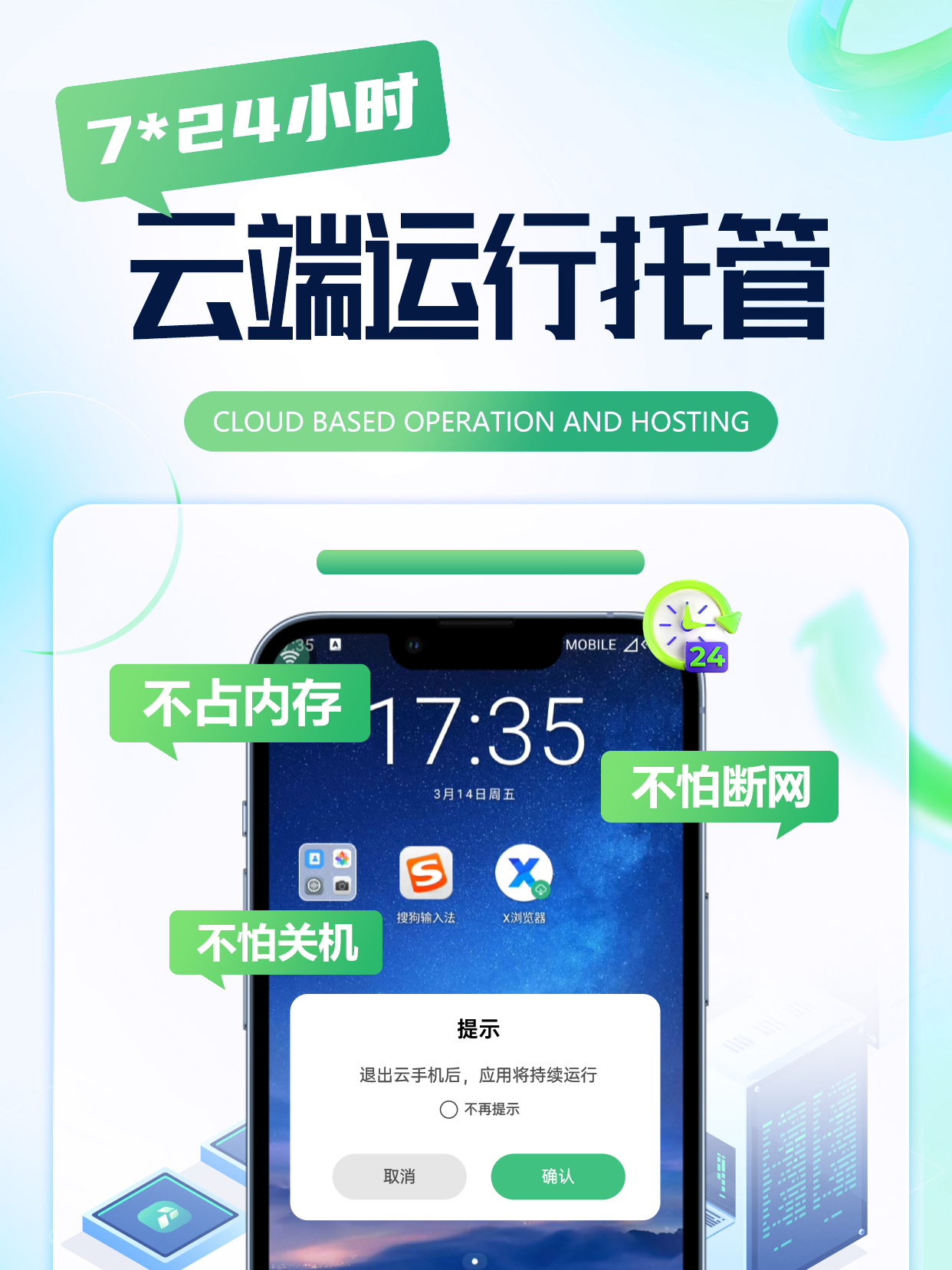 24小时云端托管是另一大亮点。掌派云手机支持全天候云端运行托管,游戏或其他应用可在云端持续运行,不受本地设备开关机、断网等因素影响。