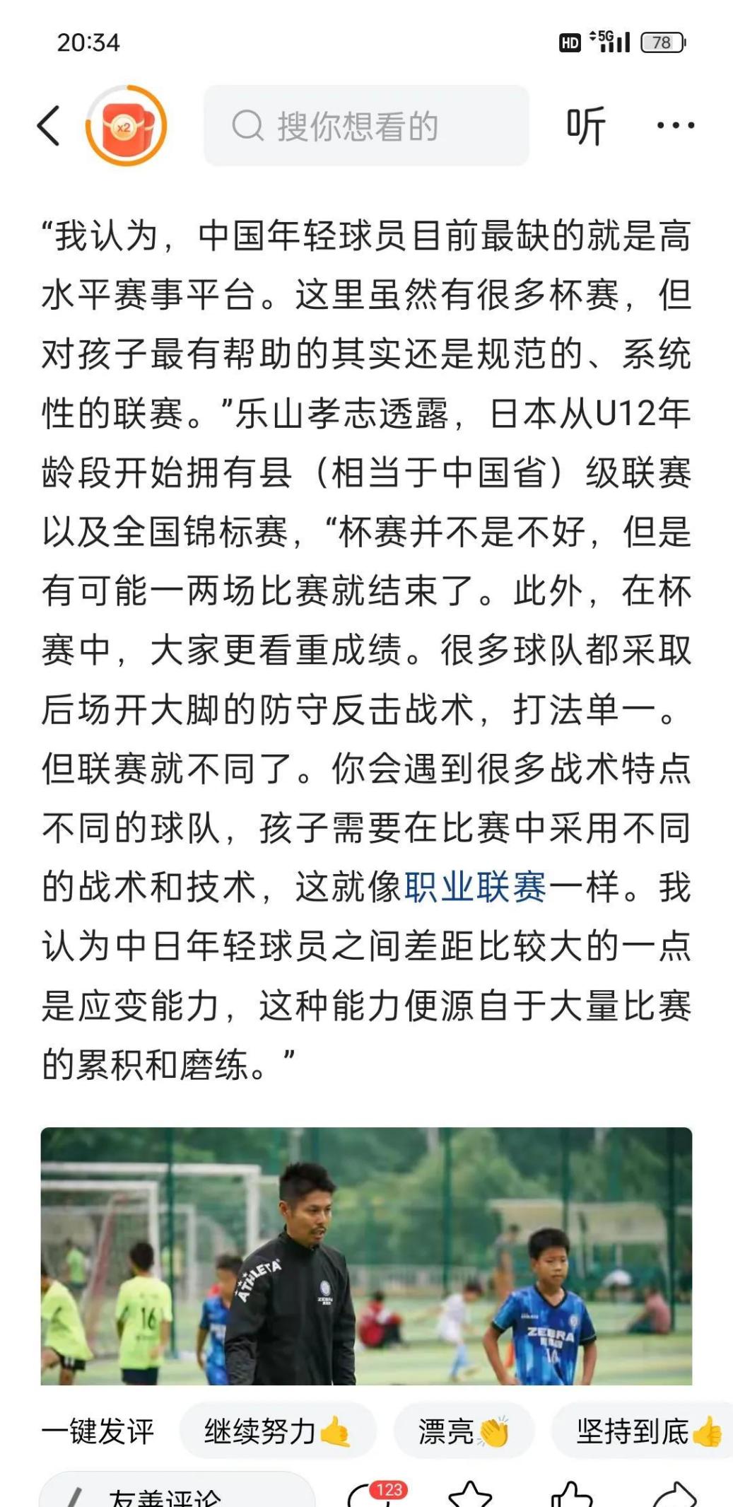 乐山孝志说,看到孩子们不断进步,能做出前一天无法做出的技术动作,是最开心的事。这种感觉估计很多教练都能体会到吧看着自己教的孩子一天天进步,确实是件很有成就感的事。他还说,孩子的成长是他坚持的动力,这话听着挺暖心的。不过,在中国搞足球青训肯定不容易,家长的期望、社会的压力,还有各种现实问题,都可能会影响到教练的工作。乐山孝志是怎么处理这些问题的呢他有没有遇到过什么特别棘手的情况