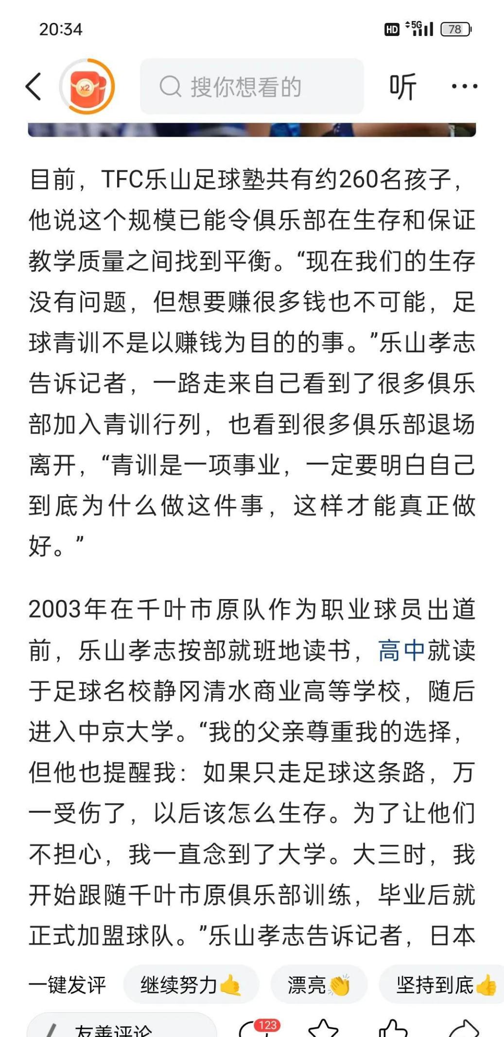 乐山孝志说过,他选择当足球运动员纯粹是因为兴趣,这话听着挺耳熟的,很多运动员都这么说。但是他还足球青训不是以赚钱为目的的这就有点意思了。在现在这个商业化的足球环境里,还能保持这种纯粹的态度确实不容易。他退役后选择留在深圳搞青训,创办了TFC乐山足球塾,看来是真的热爱足球,想为这项运动做点什么。不过,在中国搞足球青训,肯定会遇到不少困难吧毕竟中国的足球环境和日本差别挺大的。