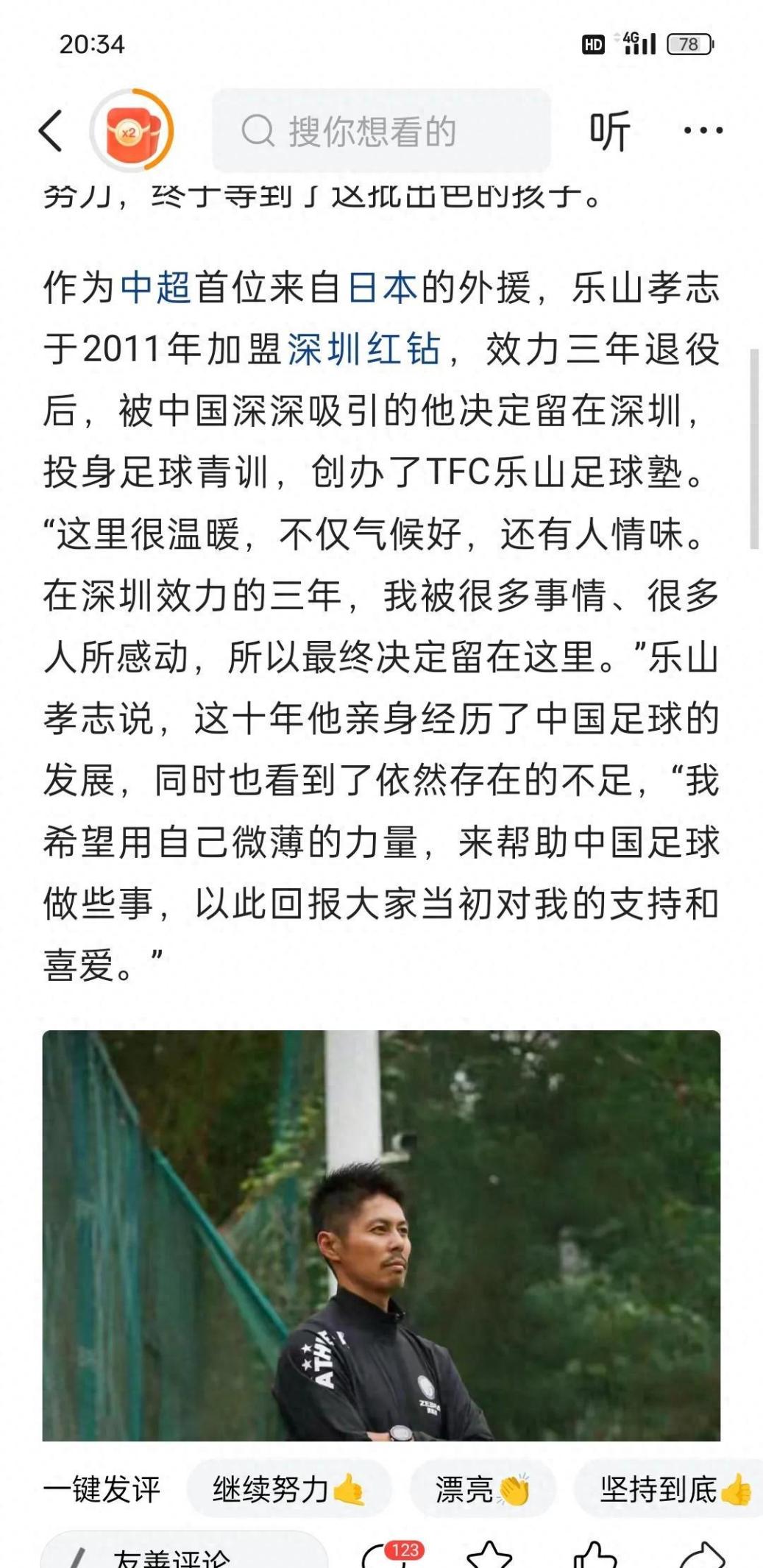 乐山孝志这个日本人来中国踢球真是有意思,他说想去没人去过的地方,结果就来了深圳,还在这儿扎根了,搞起了青训,挺不一样的经历。