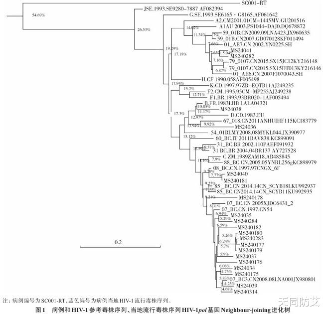 初步推断此病例的 HIV-2 感染可能来源于 HN001。为了进一步探究传播关系,研究对病例样本进行了基因检测,成功扩增了 HIV-2 pol 区的 RT 区域。将病例的 RT 区序列与 HIV-1 和 HIV-2 参考毒株以及 6 条湖南省 HIV-2 感染患者的序列(包括 HN001)进行比对,结果显示病例与 HN001 及 HIV-2 参考毒株聚集在一簇,而与 HIV-1 参考毒株和当地流行毒株序列分离。