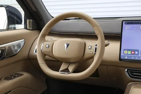 这款车的外观设计也挺耐看,走的机甲风格,线条硬朗流畅,前脸的分体式大灯点亮后很有辨识度,车顶的激光雷达不仅实用,也成了一个显眼的科技标识。车身侧面用了隐藏式门把手,既好看又能降低风阻,多幅式轮毂也提升了整车的气质。车尾的贯穿式 LED 尾灯夜晚点亮时辨识度很高,下方的黑色包围还增添了一些运动感。