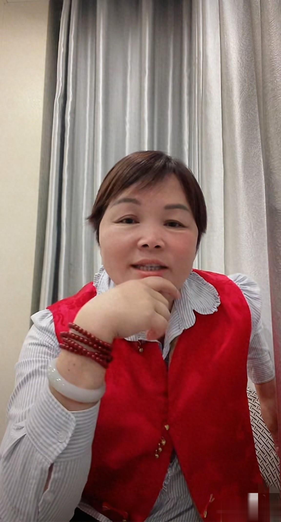 叶锐聪妈妈的红马甲。刚开始东姐没有加那件红马甲,她穿着一件竖条纹的衬衣在直播,可是播着播着她说扣子开了。