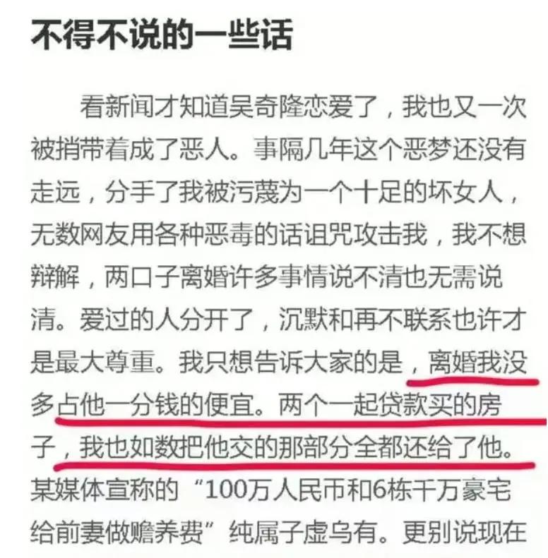 后来越传越离谱,我看到的版本是又多了一个0,变成了1000万人民币。吴奇隆的妈妈则在采访中说,离婚后吴奇隆把房产都给了马雅舒。