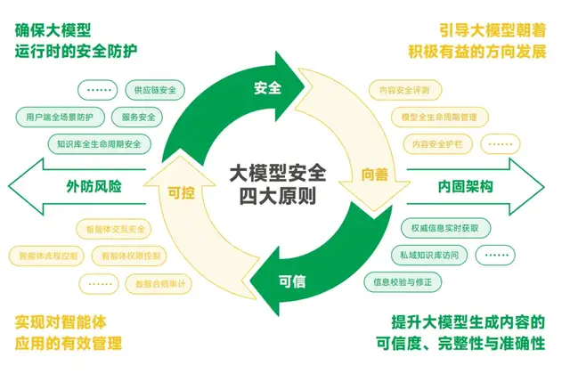 平台原生安全则聚焦大模型数据、知识库、智能体及客户端等环节,将安全能力嵌入核心组件,强化配套组件安全与全流程合规管控。