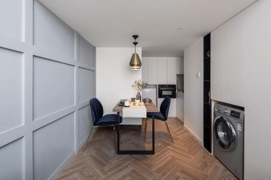 餐桌椅的款式是比较简约和精致的,木质桌面和黑色桌脚,餐椅由蓝色布艺坐垫和金属脚结合,搭配灰蓝色的背景墙和人字铺的地板,很有格调感。