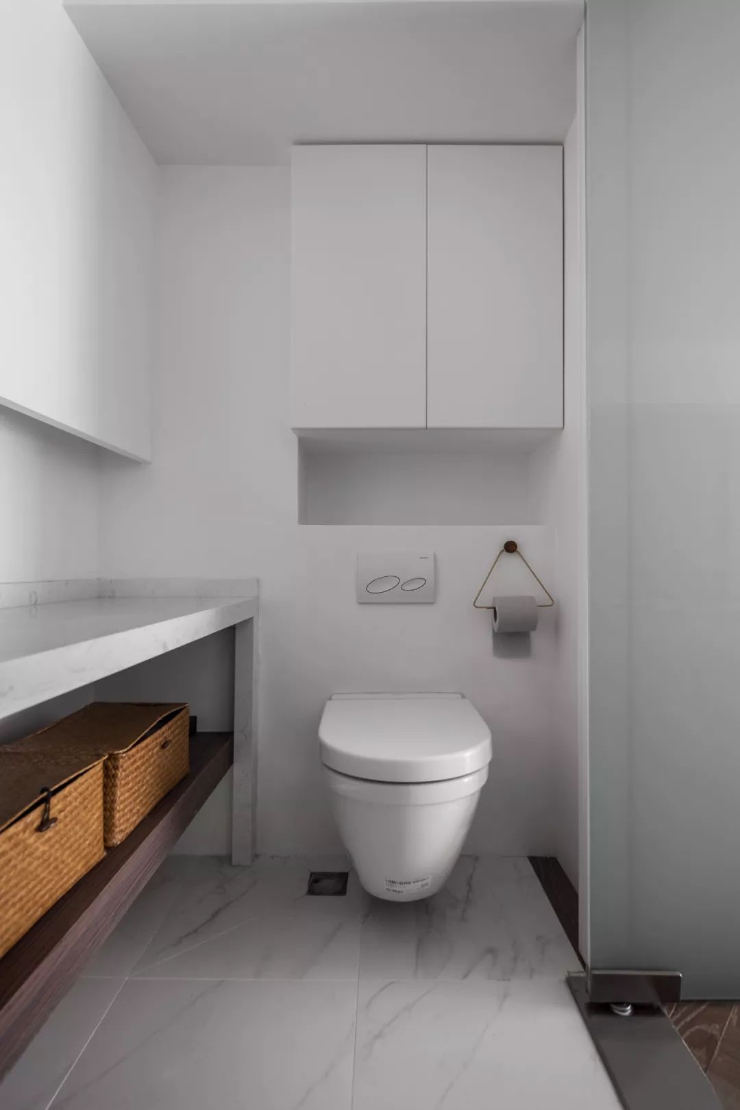 卫生间被放在了二楼,用磨砂玻璃门作为隔断,卫生间地面铺贴大理石瓷砖,马桶上方也做了吊柜的设计,增强收纳能力。