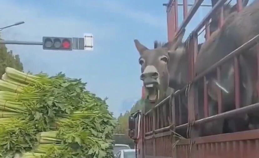 一头驴正在偷吃同行车辆上的芹菜,而后面的车里就疯狂的按喇叭提示,刚吃了几口的驴,好像明白了什么,立马把芹菜叶子吞了下去,然后就张嘴一直叫,至于说什么我也不知道,但是感觉骂的挺脏的!