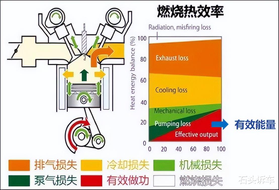 汽油发动机的热效率能做到40%就已经是顶级发动机了,但这只是发动机工作在最佳状态下的热效率,大多数时候,发动机是达不到的,比如起步和低速行驶,发动机热效率最多只有10~20%。