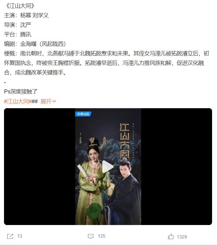 各位读者,看到《江山大同》的题材后,你们期待杨幂出演这部剧吗?让我们共同期待吧!