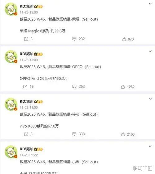 小米17系列销量达到234.8万台,远超其他品牌。vivo X300系列销量为74.2万台,OPPO Find X9系列销量为55.6万台,荣耀Magic 8系列销量为33.2万台。这些数字显示,小米17系列的表现可以用一骑绝尘来形容。