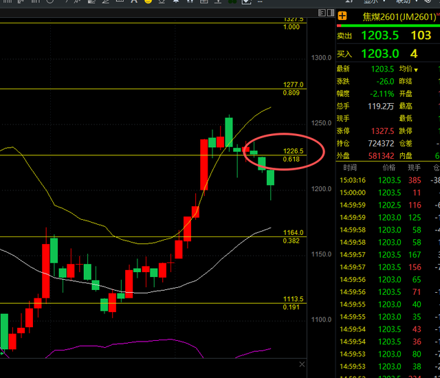 焦煤2601合约:基本面:煤矿供应端扰动或持续至十一前后。山西安检趋严或阶段性限制产量释放,部分国有焦煤矿因生产利润不佳有自主减产行为。此外,国家能源局开展煤炭生产情况核查,促进煤炭供应平稳有序,安监、环保等影响具有一定政策持续性,预计后期焦煤矿供应较难有进一步明显上行。不过,蒙煤通关量维持高位,日均通关重新站上 1200 车 / 日的高位,但优质蒙 5 的占比有所下滑,长协大户直销终端的比例明显加大。技术面:焦煤整体在冲高后调整,目前短线趋势有反弹需求,需要看上方1220得压力,破位看二次冲高加速,反之做空操作建议:焦煤反弹尝试开空压力1220