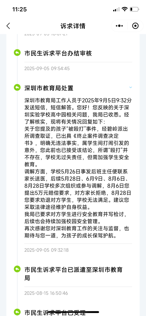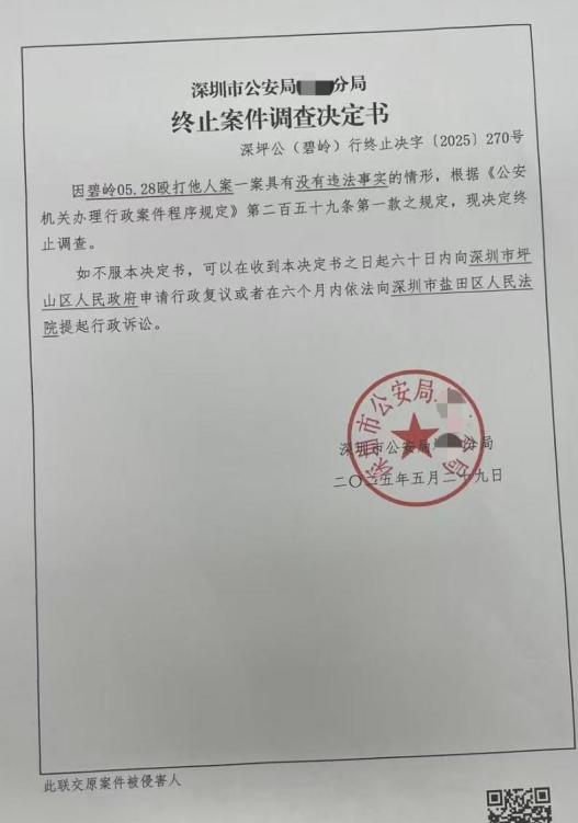 5 月 28 日,林某家长报警后,碧岭派出所调取监控并安排法医验伤,结论为 “轻微伤”。因涉事双方均为未成年人且伤情未达刑事立案标准,警方按民事纠纷组织调解。首次调解中,校方代表到场但未参与具体沟通,此次调解最终未能达成一致,警方随后出具《终止调查书》,明确案件性质为 “殴打他人案”。