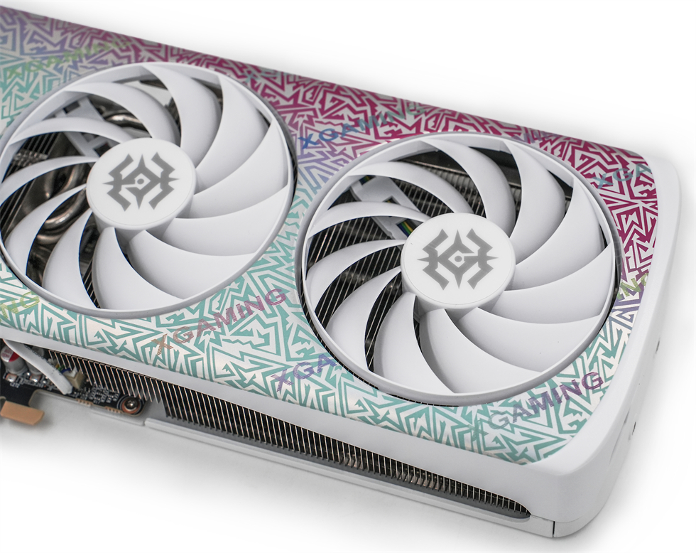 显卡背面覆盖合金背板已经是传统艺能了,背板底漆为白色,搭配有青色和紫色的图案设计,辅以“XGAMING”的标志,颇为突出,右侧的大面积开孔构成了贯穿式风道,有利于空气穿透散热,进一步提升散热效能。
