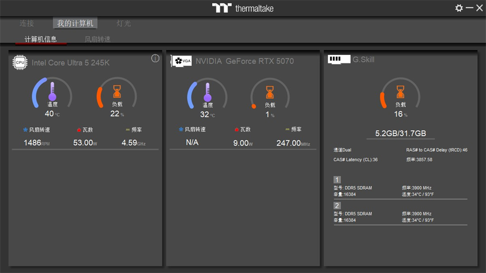 硬件调控里可以进行全局灯控设置,包括常亮、闪烁、呼吸、闪电、彩虹等各种灯光效果的选择,也可以对主板、显卡和内存的灯效进行单独设置。