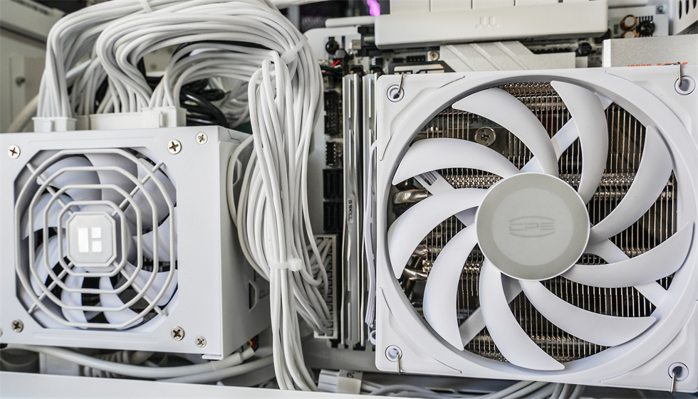 上下两侧放在一起,上侧凹槽可以看到采用ATX 3.1规范的12V-2×6电源接口,透过散热罩能看到密集阵列散热鳍片和冰脉3.0镀镍铜管热管部分真容。