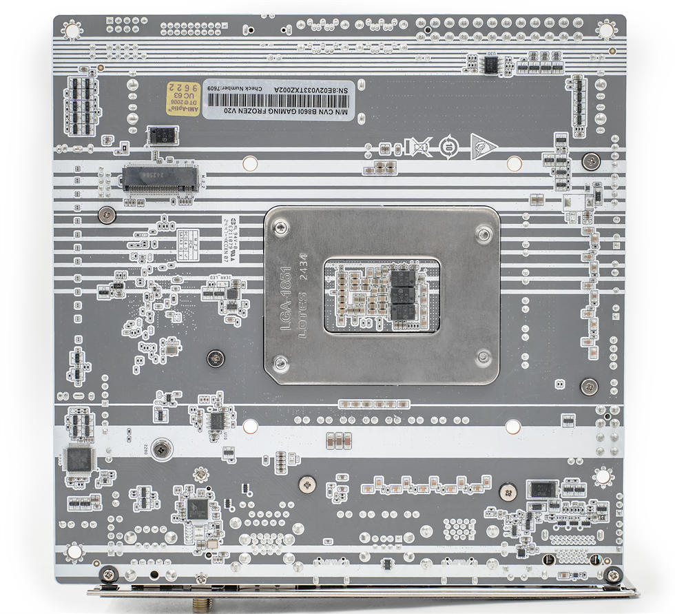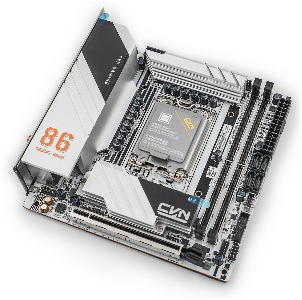 B860I GAMING FROZEN V20登陆舰标准的ITX规格,采用8+1+1+1相供电设计,整体设计语言是CVN一贯的风格,银白配色,在I/O顶盖和M.2散热装甲上辅以黑色点缀,I/O顶盖上比“CVN Gaming”更显眼的是橙色的86号登陆舰船舷号。
