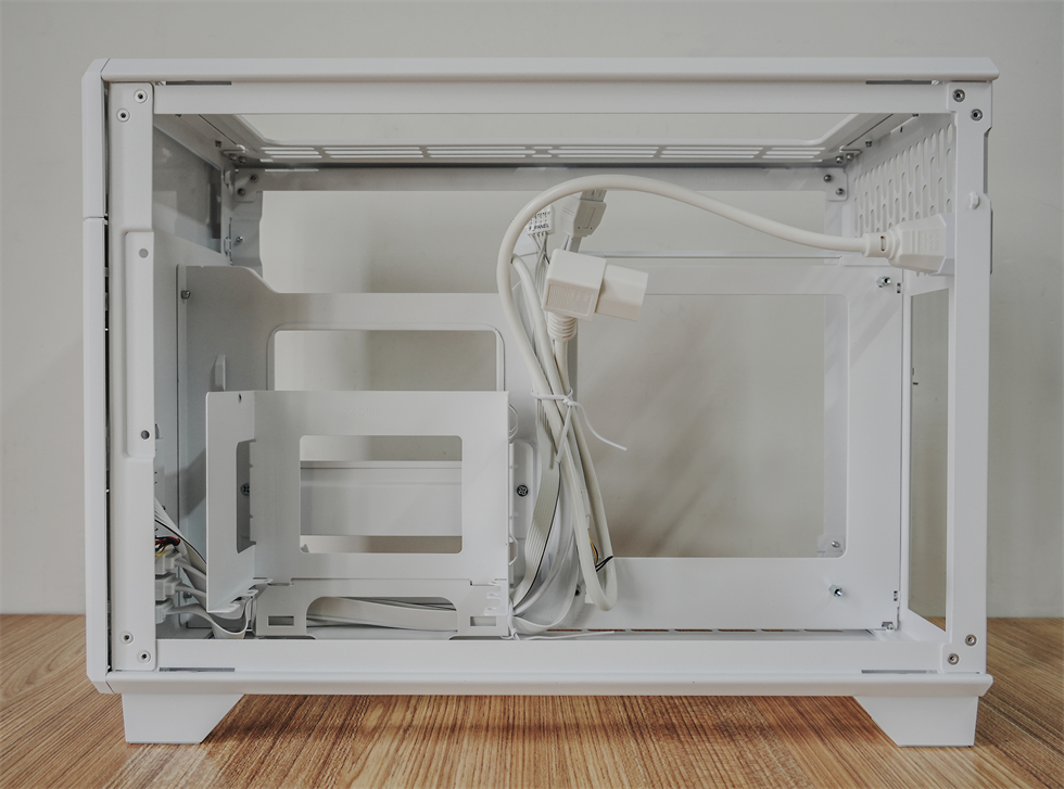 下面顶盖取下后可以看到冷排固定架,支持240/280冷排或2×120mm/140mm风扇。