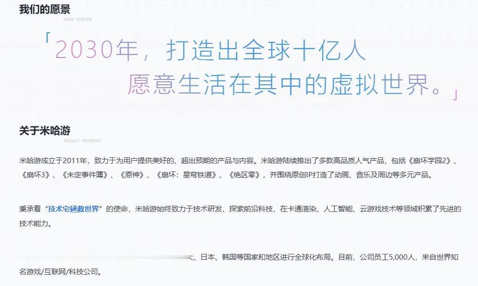 不过蔡浩宇在一些事情上,还是有着极强的个人执念。在亲手撰写的米哈游handbook上,他曾提到公司的愿景和使命,是技术宅拯救世界,是打造全球十亿人愿意生活其中的虚拟世界。如今他对自己职业生涯的终极追求,也依然是像苹果、特斯拉一样,打造世界上从未存在过的东西。