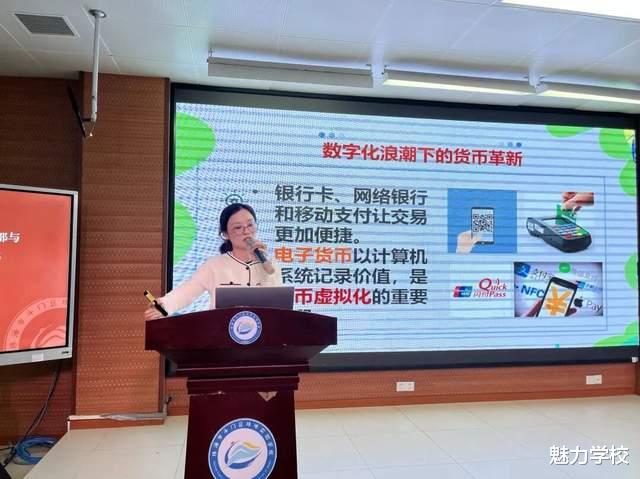 签约仪式后,广东金融学院金投教工第一党支部组建的“金融博士宣讲团”为珠峰学子带来系列讲座。该党支部党员李心雅博士为珠峰实验学校初二年级的100余名学生带来《货币的起源和发展》专题讲座。李老师凭借生动有趣的案例,系统梳理了货币形态的演进脉络,并结合现代金融热点,对比特币、稳定币等加密资产进行了深入浅出的解读,帮助同学们建立了对货币的基础认知,并激发同学们对金融领域的探索兴趣。随后,党员杨睿博博士开展了《给地球的投资:解锁绿色金融的酷能量》为主题的演讲。他从绿色环保的重要性切入,阐释了绿色金融在推动经济建设、实现“双碳”目标中的重要意义,并以“上海中心”绿色建筑为例,直观展示了幕墙节能、雨水回收、微气候调节等节能环保的应用场景,让同学们深刻理解到金融与环境保护、社会发展的紧密联系,进一步拓宽了知识视野。