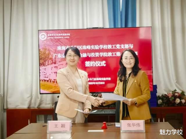 为深入贯彻落实新时代党的建设总要求,以“七个有力”为抓手打造坚强堡垒,推动党建与学校教育高质量发展深度融合,打造“珠峰·旗帜”品牌,培养德智体美劳全面发展的社会主义建设者和接班人,2025年10月22日,珠海市斗门区珠峰实验学校党总支与广东金融学院金投教工第一党支部举行党建共建协议签约仪式,以党建引领深化校地合作,共绘高质量发展新蓝图。珠峰实验学校教育集团党支部书记、总校长、珠峰实验学校党总支书记、校长张华伟和广东金融学院金融与投资学院教工第一党支部书记、金融系主任王颖副教授等人出席仪式。
