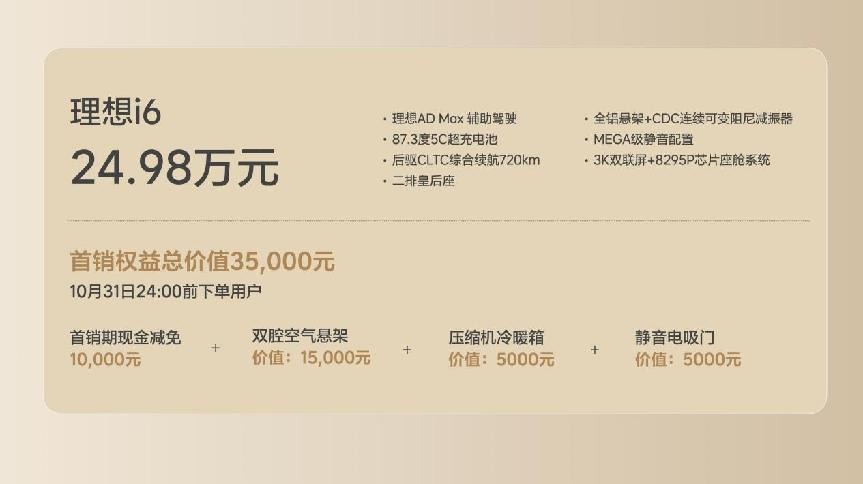 理想i6还为用户提供了丰富的配置选择,包括价值10,000元的21.4英寸3K后舱娱乐屏与超清流媒体内后视镜、价值20,000元的前后双电机四驱系统(额外赠送21英寸七辐运动轮毂)、价值15,000元的双腔空气悬架、价值5000元的静音电吸门、价值5000元的8.8升智能冷暖双用冰箱、价值5000元的铂金音响以及价值3000元的原厂拖挂套装。