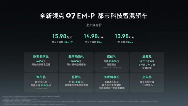 动力性能的细节也兼顾了节能与实用,全新领克07 EM-P采用前置前驱驱动形式,匹配3DHT变速箱,搭载插电混动动力总成,起步时动力输出平缓,不会出现窜动的情况,适合城市通勤;高速行驶时动力储备充足,超车时能快速响应,同时能耗保持在较低水平,符合日常用车的节能需求。目前这款车型已正式上市,限时价13.98万起。
