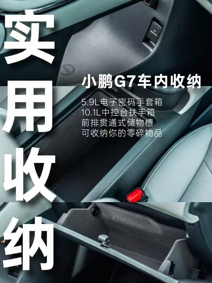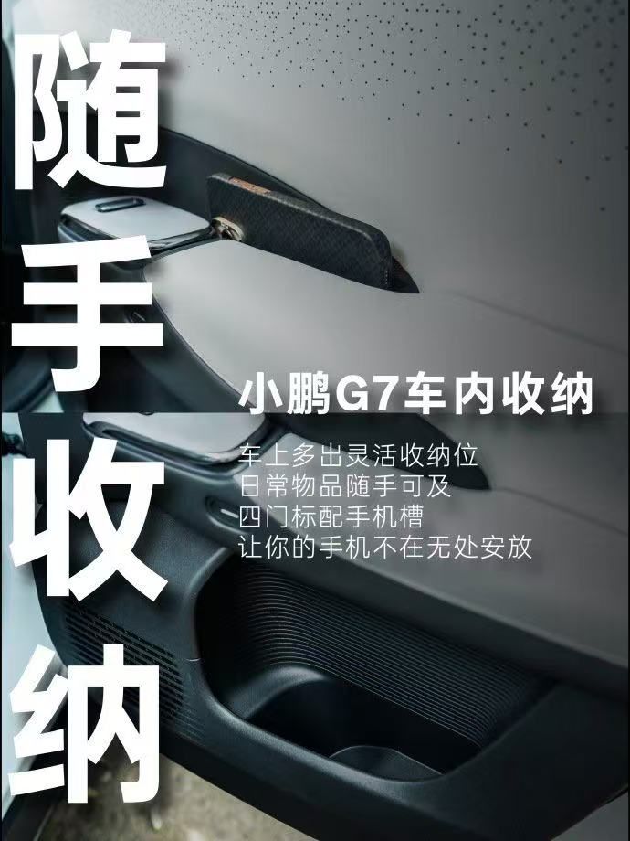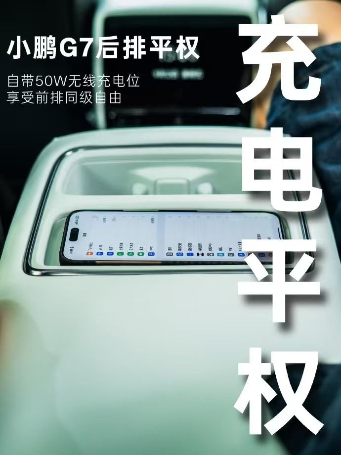 大件能装,小件也可以!小鹏G7车内多达100处的储物设计,布局合理,让你的零碎小东西,也能有位置安放!而后排乘客也能获得同时超大的空间体验,随时随地可翘起二郎腿,后排扶手箱甚至还给你布置了50W的无线充电位,这种后排平权的体验,对于一款家用SUV来说太重要了!