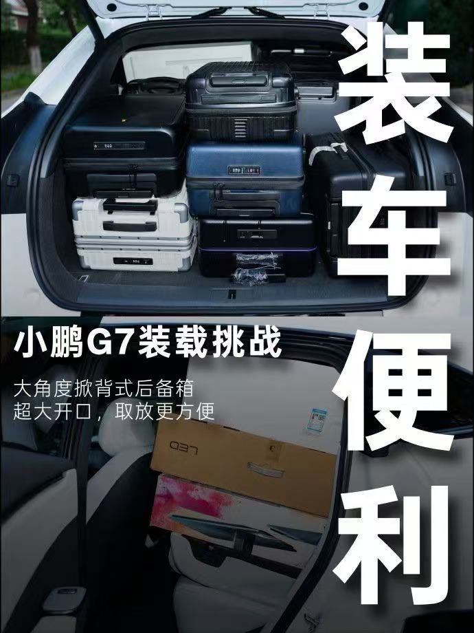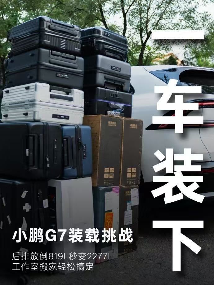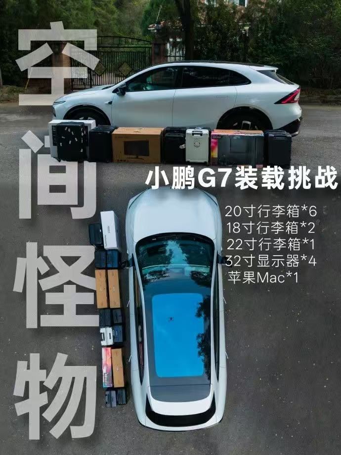 819L的后备箱,放倒后可以拓展成2277L的超大空间,在配合超大开合角度,甚至可以装下一个沙发,我们尝试装了6个20寸行李箱、2个18寸行李箱、1个22寸行李箱、4台32寸显示器包装盒,以及一台苹果Mac的包装盒,一整个工作室搬家有小鹏G7 都够了!