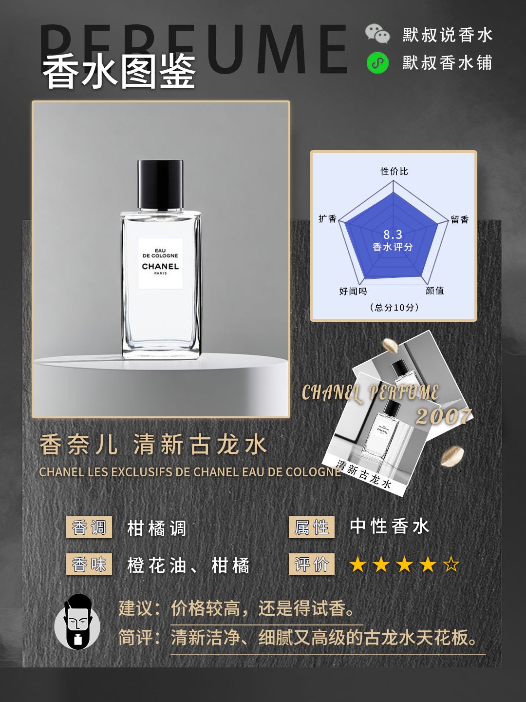 这款香奈儿的清新古龙水,默叔觉得可以称作“古龙水”天花板之一了;虽然性价比不是很高,但是香调的用料你能很明显的感觉到质感的高级,并且香调平衡度十分之高,没有一丝的突兀感,除了留香时间和价格真的是硬伤之外,没有其他的缺点了。