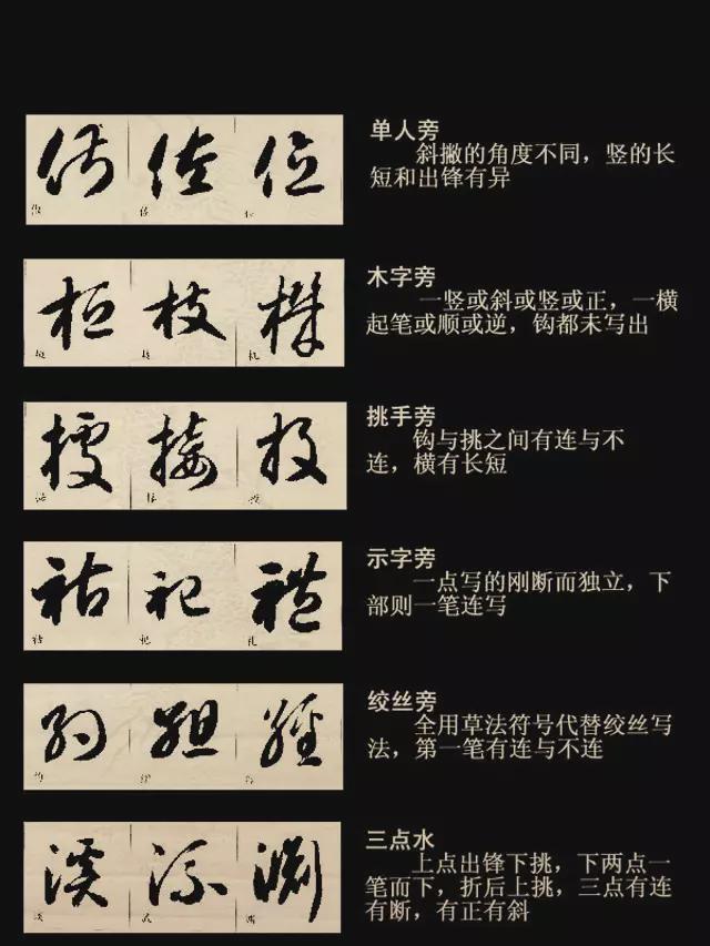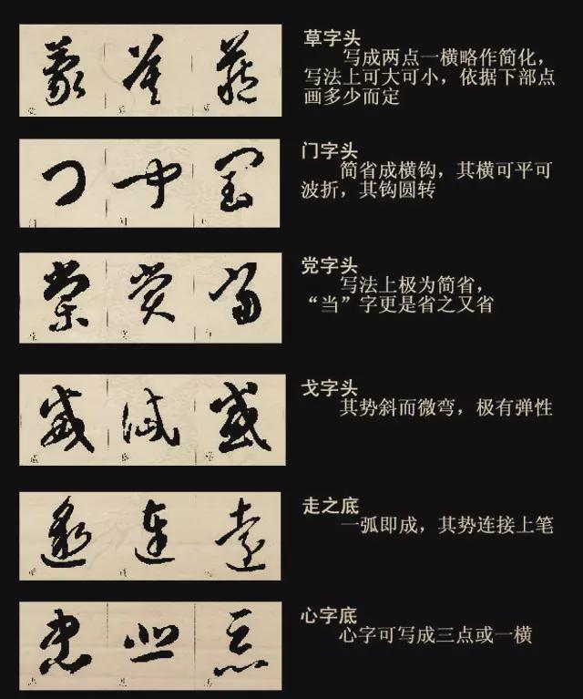 草书结体为求简约,其偏旁都用符号代替,使草书点画的形态产生极大的变化,与楷、行书的结字有相当差距,这是草书结字的特点。但草书还应受草法约定俗成的规矩制约,草法是有严格规则的,绝对不能信手画符,随心所欲,俗语说:“草书脱格,神仙不识。”草法不能脱格,这“格”就是规矩。戈守智《汉溪书法通解》中说:“草书不难于狂逸,难于狂逸中不违笔意也。”所以,历来书家都指出,写草书要有扎实的楷书基本功。赵构《翰墨志》中说:“前人多能正书而后草书,盖二法不可不兼有。正则端雅庄重,结密得体,若大臣冠剑,俨立庙堂草则腾蛟起凤,振迅笔力,颖脱豪举,终不失真。”未有楷法不立而能疾笔狂走者,还是孙过庭说得好:“图真不悟,习草将迷。”