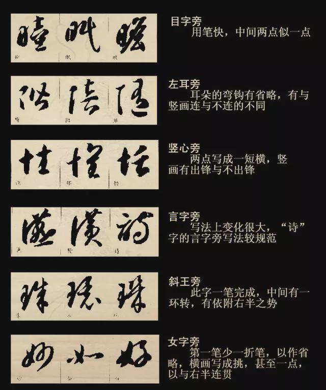 草书结体注重变化与随意,当然,小草结字规范化也很严格,但同一字可有多种草法,变化多端。大草结字可用“神秘莫测”四字喻之,自由度更大。自由度大并非可以随心所欲,实际上是更难把握其正确性。草书结体的不规则是从规则中来,在规则中生出不规则,凡不规则的总比规则的要难以把握,因其不规则,所以能冲破平淡,给人以惊险之感。但又因包含规则,所以又觉很大方、流畅,笔笔相属,字字顾盼,字中有情、弦外有音,天真自然,生气勃勃,既曲尽物象又合乎自然法则,既突破常规又合乎情理,给人以无穷的回味和想像。
