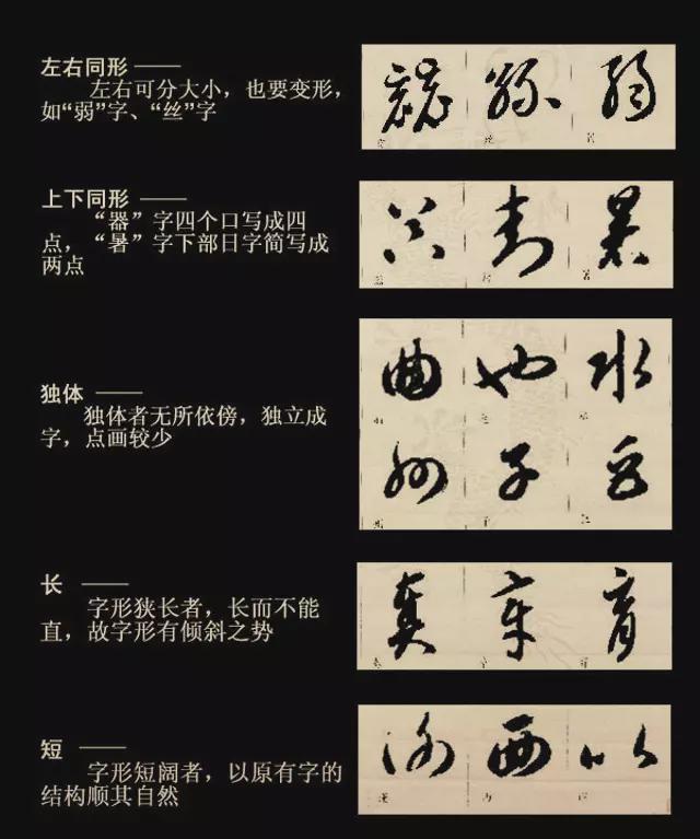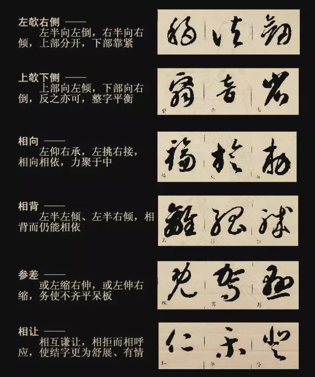 一般楷、行、隶书的结体都求平正、匀称、协调,以对立统一的法则,使结字能有疏密,长短、窄阔、伸缩、奇正、俯仰、向背等变化,使结字能长短合度,四面停匀。但是草书的结构它遵循的不是匀称的原则,而是取决于书写者内心情绪的变化。一般草书都置乎正、对称于不顾,追求着不平衡的美,因为在不平衡、不匀称中使字更具有动荡感,动荡是草书的关键,尤其是大草,即使某一字失势,.倾侧失去重心,也可利用腕力在以下几个字中将字势向另一侧倾侧,使整个结构得以平衡。所以草书结体并不是不要平衡,而是追求整体效果的不失重心。汉字是由各种不同的点画连贯交接而成,书法是将汉字点画的组合排列,长短轻重各尽其变化之能事,使艺术形象瑰丽多姿,耐人寻味,惟一应遵守的法则是字的重心的平衡。凡能在结构上守住重心,则构思不论如何独特,组合如何险峻,都是符合结构美原则的,变化与平衡是有矛盾的,但结构之艺术性也就产生在这矛盾之中。