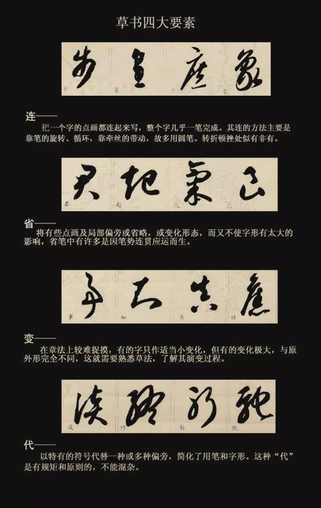 若以楷书的结构点画为标准,则草书的首要特点是简约,笔画省而又省、简而又简。孙过庭曰:“草以使转为形质,点画为性情。也即是草书的结体以使转为主,字之体势一笔而成,“草乖使转,不能成字。”其使转忌横平竖直,有棱有角,所以草书点画线条的运动多呈圆弧形,这是行笔速度快而流畅所必然产生的用笔法。草书连绵常数字为一笔,线条牵连不断,有时两三字连在一起,难以断字,形态变化极为强烈,各种俯仰、疏密、向背、迎让,参差的对比可以夸张到惊人的地步。问题不在是否连绵,在于连的过程中在转折等处是否有断的意思,贵在能似断似连,故明末清初大书家王铎的草书虽常十数字连绵不断,而因其笔笔有交代而仍为后世所重。