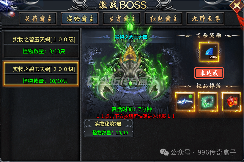 做任务的时候不要忘记挑战BOSS,绿色就显示你可以进去当前地图。除了灵符霸主是每个图都有,其他的实物霸主、生肖霸主、红包霸主和九醉至尊都是秘境BOSS。会标注剩余BOSS的数量,如果显示是绿色的,那就赶紧去刷!
