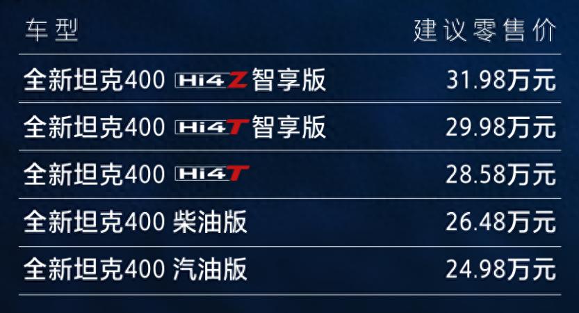 2025年11月6日,长城汽车正式推出全新坦克400。新车共推出五款车型,价格区间为24.98万-31.98万元。其中,2.0T汽油版车型最大功率185kW,峰值扭矩380N・m,匹配自主研发纵置9AT变速箱,传动效率达97%,WLTC综合油耗为9.85L/100km,确保城市通勤场景下的平顺驾驶体验与燃油经济性;2.4T柴油版车型具备490N・m低速峰值扭矩,在1500rpm转速下即可输出峰值动力,即便在4700米高原环境中,仍能保持400N・m扭矩输出,配合78L大容量油箱,续航里程可达1000公里左右,为长途穿越场景提供可靠动力支撑。