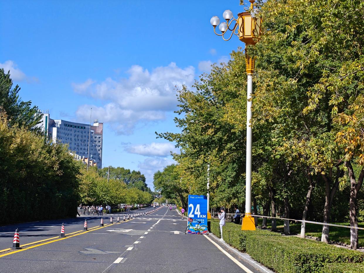 ▲远处左侧的烟囱、电塔,右侧林立的楼群,加上蓝天白云和赛道上稀拉的跑友,很有一种如画般的纯净之美。