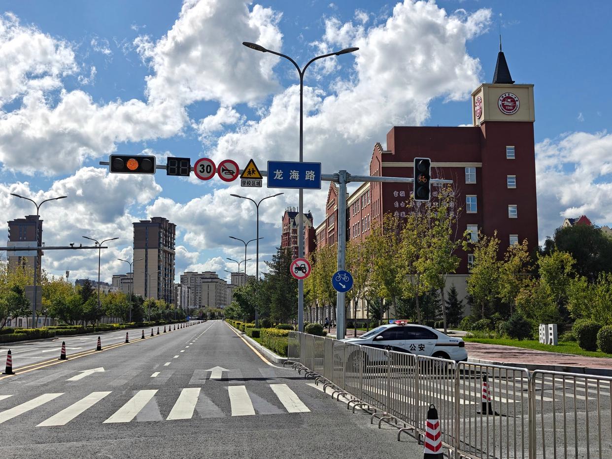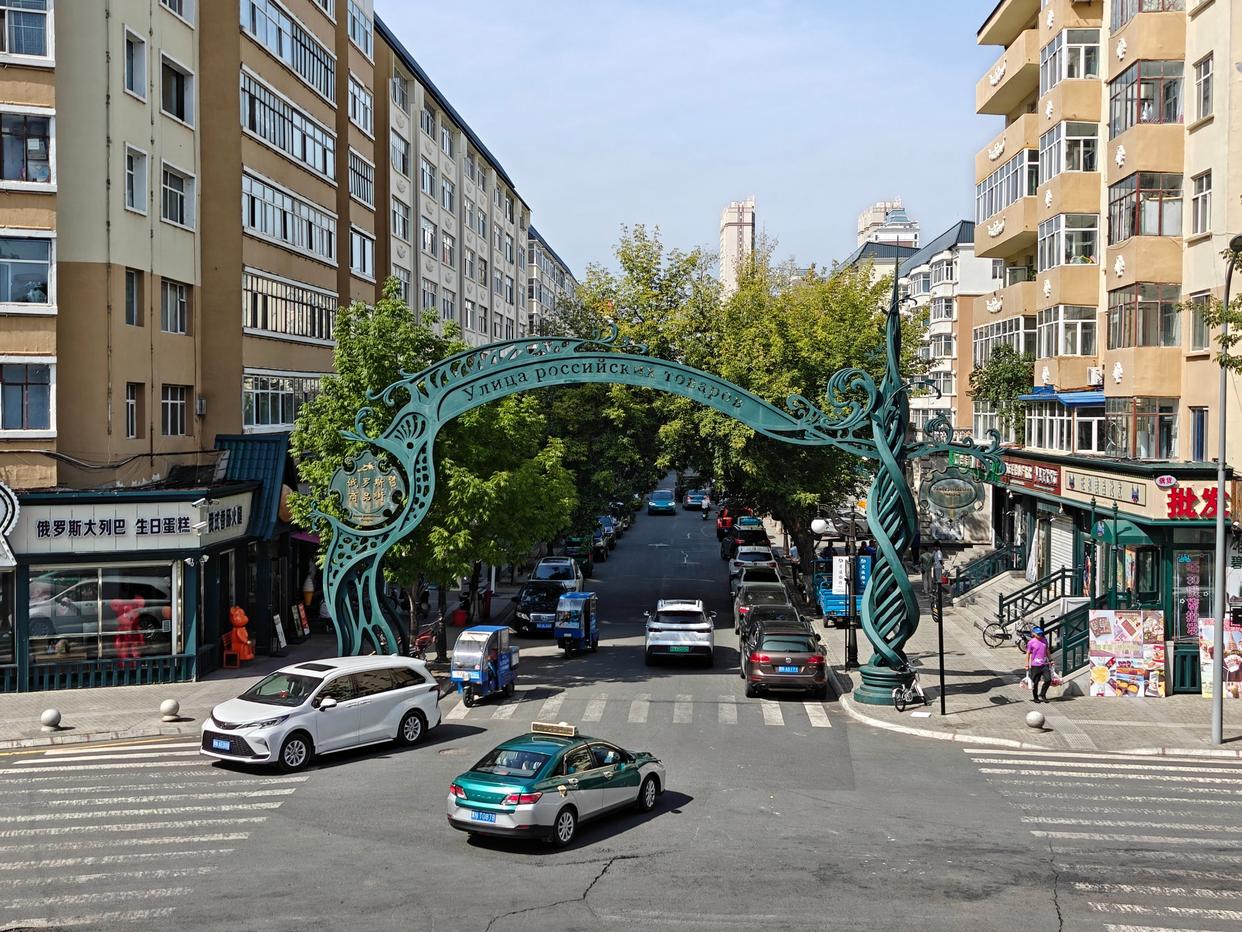 ▲灯柱上挂着“中俄文化大集”的旗帜,一路都是,蔚为壮观。有趣的是,我后来离开黑河时,刚好看到工人开着吊车在那拆旗子,完美闭环了,属于是。
