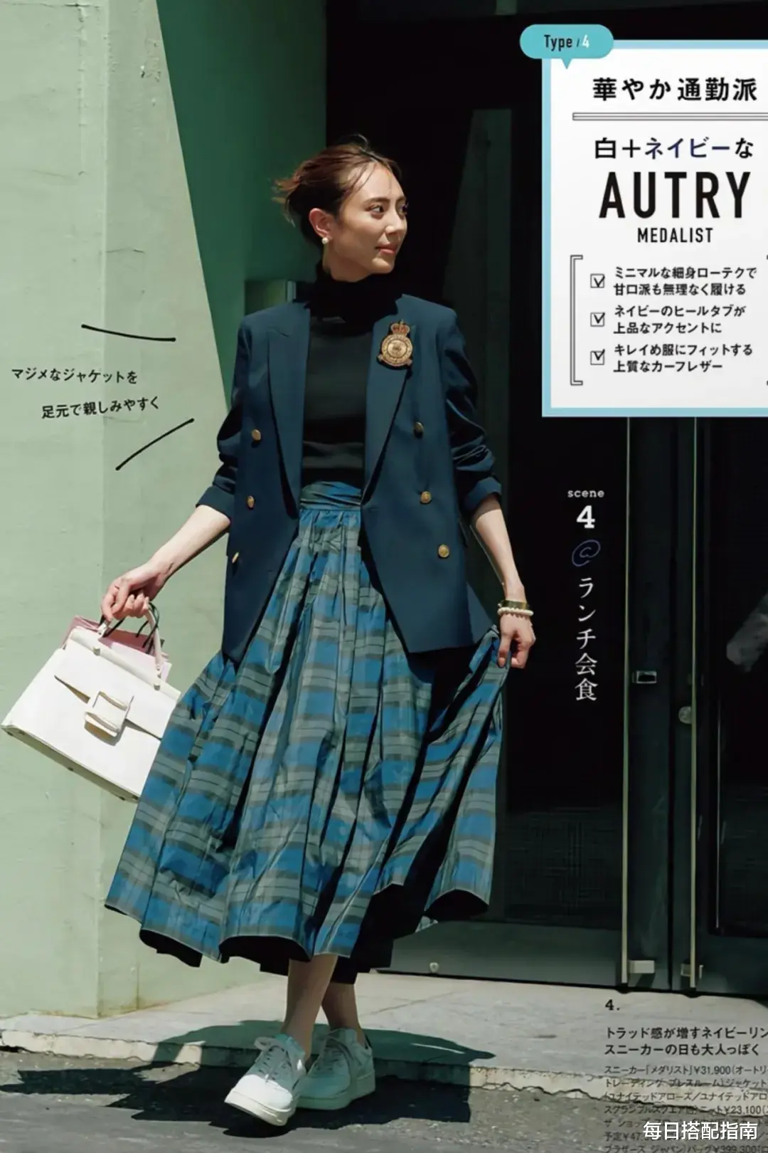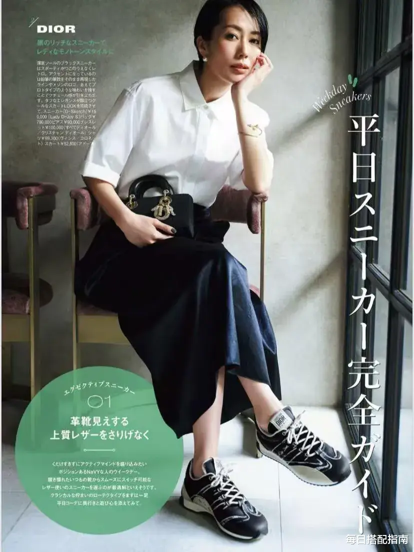 “半裙+运动鞋”的美妙在于它的对比感。半裙柔美、轻盈,能展现女性化的一面;运动鞋中性、利落,带来动感和活力。